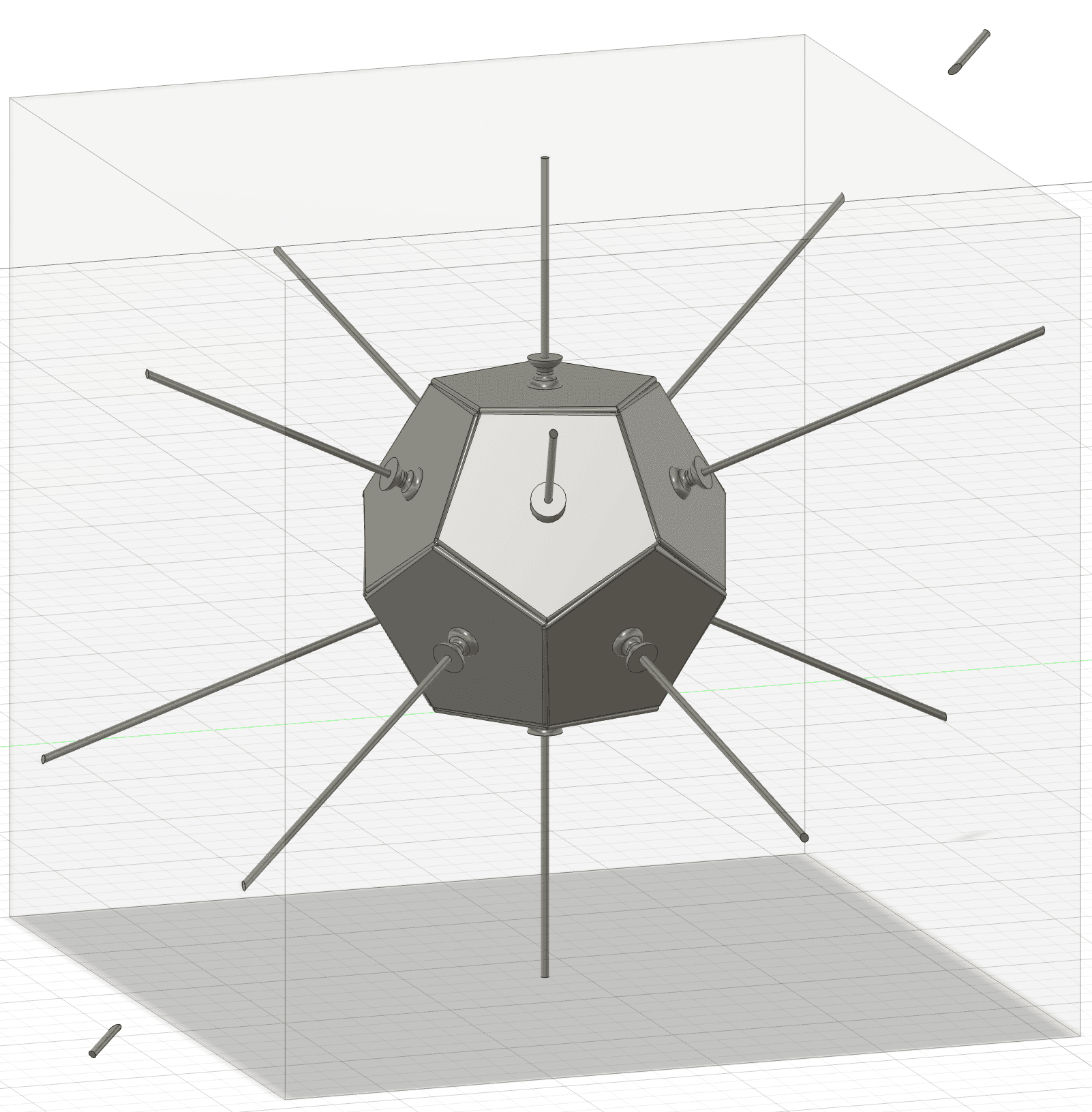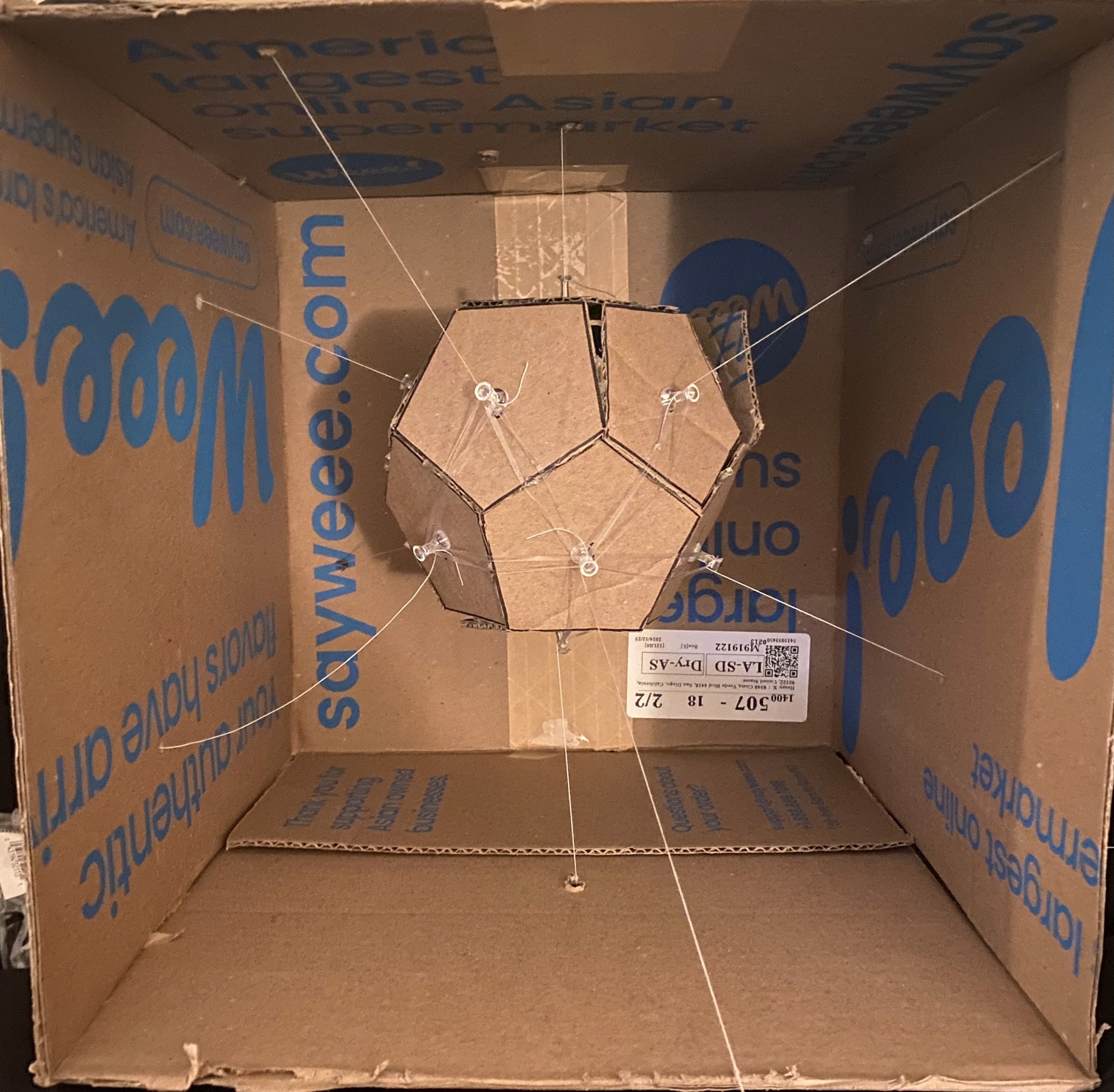 Later I tried to connect them with clothing thread and push pins onto a box. This helps me to form a basic concept of how to model out the 3D piece and also made me think about what are the exact positions of the motors on box's surface (so the line stays straight, tight, and perpendicular to each dodecahedron's faces.